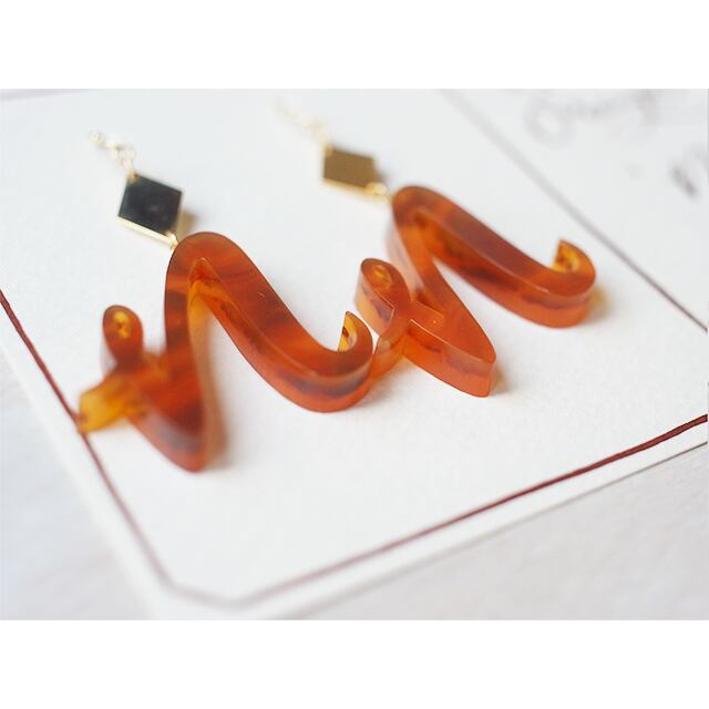 オレンジがかったべっ甲の分厚いアクリルを、オリジナルデザインのアルファベット形状でカットしております。アクリルの板自体も1点もので、カットした部分によっても表情が変わるので、完全な1点ものとなります。大ぶりで存在感があり、コーディネートのアクセントとしてお使いいただけます。また、大ぶりですがアクリルですので着け心地はとても軽いです。